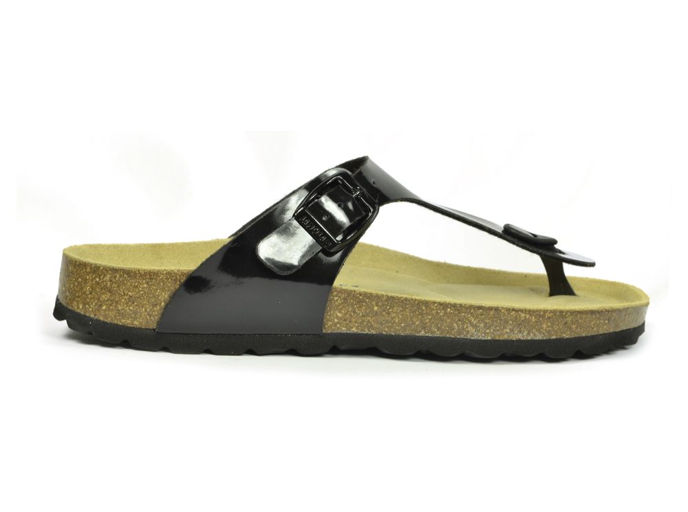 Sanosan Geneve Lacquered Black is a Lacquered version of the "Geneve" Toe thong sandal. Each sandal comes with the comfort of the Sanosan Footbed with a strap and buckle feature.
